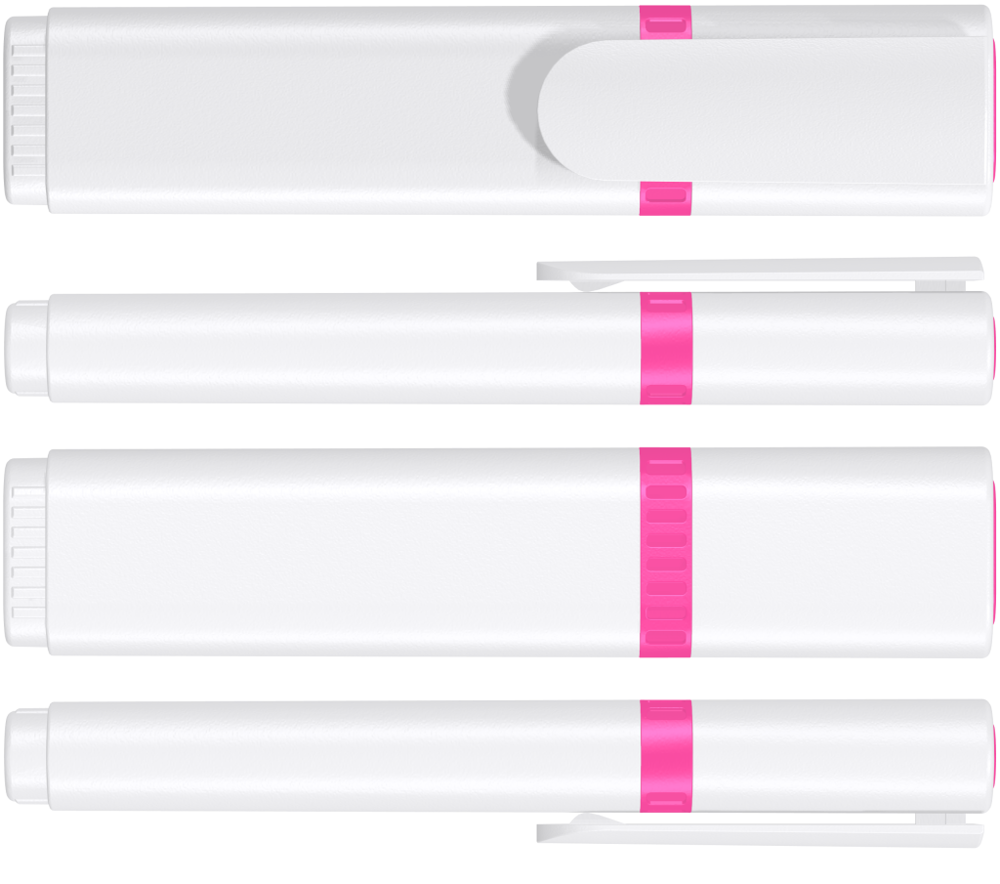 Textmarker mit Kunststoffgehäuse, Kappe und Clip in weiß. Mundstück mit Zierring und Stopfen in der Schreibfarbe. Standardfarben gelb, grün, magenta, blau, orange.