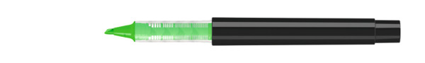 Flüssig-Textmarker mit Gehäuse aus recyceltem PET-Material in gedeckt glänzend weiß oder schwarz. Stopfen in den 6 möglichen Schreibfarben.