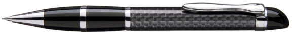 Edler Carbonfaser Metalldrehbleistift (0,7mm) mit farbiger Griffzone, flexiblem Metallclip, Metallzierring und Metallspitze glanzverchromt.