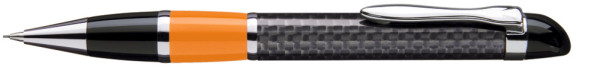 Edler Carbonfaser Metalldrehbleistift (0,7mm) mit farbiger Griffzone, flexiblem Metallclip, Metallzierring und Metallspitze glanzverchromt.