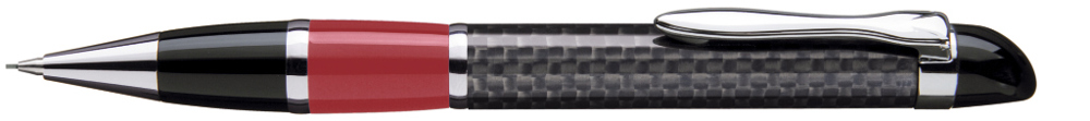 Edler Carbonfaser Metalldrehbleistift (0,7mm) mit farbiger Griffzone, flexiblem Metallclip, Metallzierring und Metallspitze glanzverchromt.