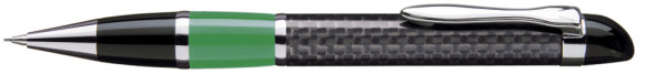 Edler Carbonfaser Metalldrehbleistift (0,7mm) mit farbiger Griffzone, flexiblem Metallclip, Metallzierring und Metallspitze glanzverchromt.