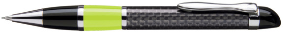 Edler Carbonfaser Metalldrehbleistift (0,7mm) mit farbiger Griffzone, flexiblem Metallclip, Metallzierring und Metallspitze glanzverchromt.