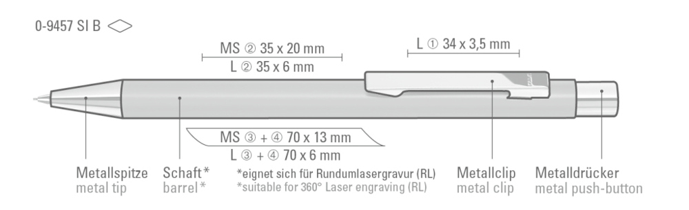 Metall-Druckbleistift (0,7mm) mit mattem Gehäuse. Metallclip, Metallspitze und Drücker silber glänzend. Radiergummi im Drücker.