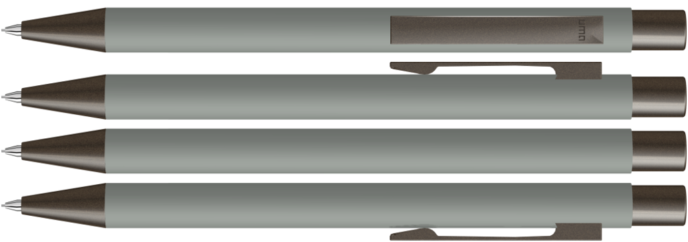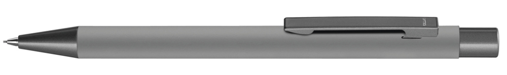 Metall-Druckbleistift (0,7mm) mit Softtouch-Gehäuse. Metallclip, Metallspitze und Drücker GUN metallic. Radiergummi im Drücker.