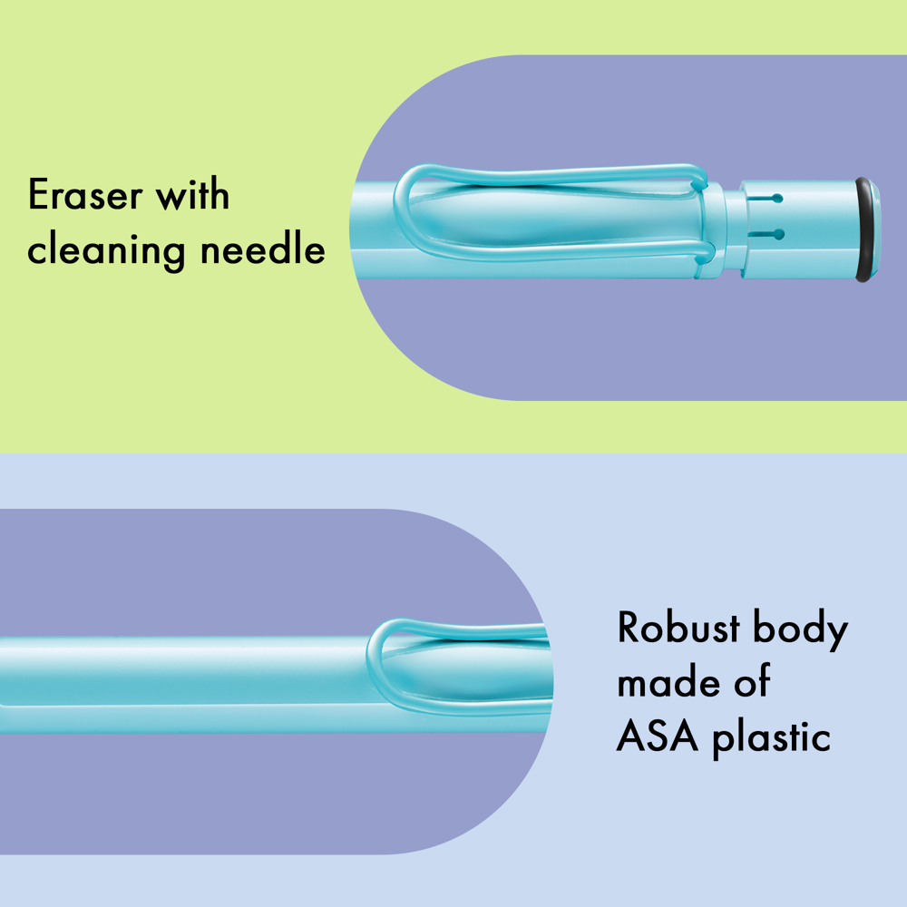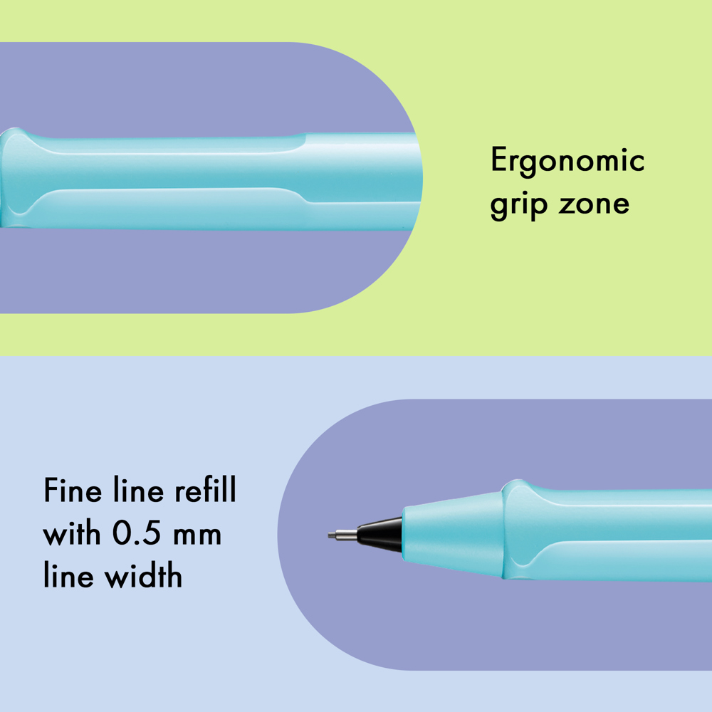 Der LAMY safari ist mehr als die Summe seiner Details: Er ist ästhetisch, robust und individuell. Der markante, selbstfedernde Clip hält das Schreibgerät sicher an Ort und Stelle befestigt. Das Gehäuse aus schlagzähem Kunststoff macht ihn zum robusten Begleiter in jedem Umfeld und die abgeflachte Form verhindert versehentliches Wegrollen. Funktionale Details wie subtil ergonomisch geformte Griffflächen und ein Sichtfenster zur Kontrolle des Tintenstands fügen sich wie selbstverständlich in das Design ein und machen den LAMY safari zum modernen Klassiker. Aus robustem ABS-Kunststoff, griffsympathisch durch markante Griffmulden, mit verchromtem, selbstfederndem Metallclip