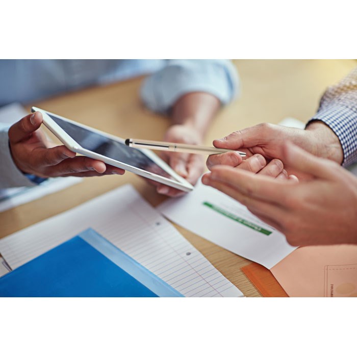 Drehkugelschreiber mit Stylus aus recyceltem Aluminium. Mit verchromtem Clip. Blaue Tinte. mehr