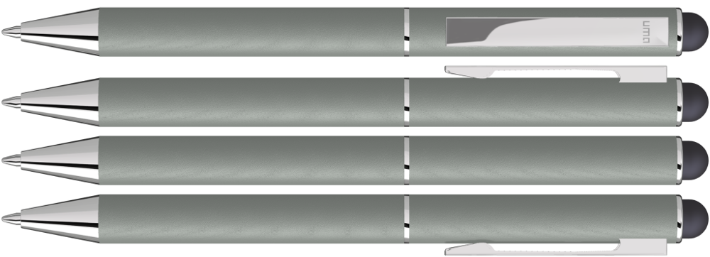 Metall-Drehkugelschreiber mit mattem Gehäuse. Metallclip und Metallspitze silber glänzend. Gummiertes Schaftende für die Touchscreensteuerung.