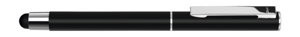 Metall-Rollerball mit mattem Gehäuse. Metallclip und Zierring silber glänzend, Griffzone schwarz. Gummiertes Schaftende für die Touchscreensteuerung.