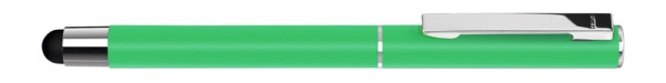 Metall-Rollerball mit mattem Gehäuse. Metallclip und Zierring silber glänzend, Griffzone schwarz. Gummiertes Schaftende für die Touchscreensteuerung.