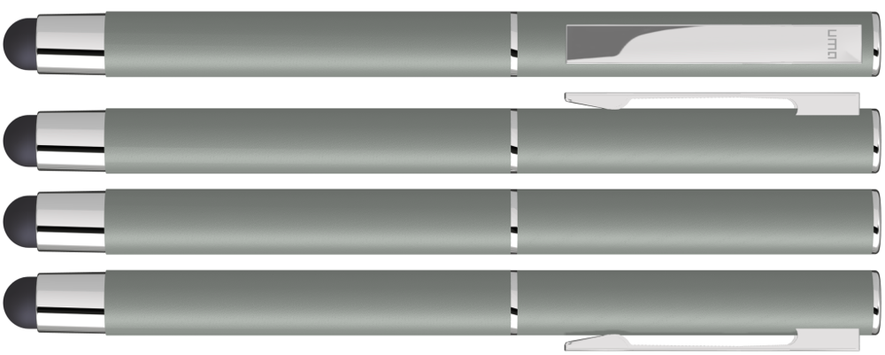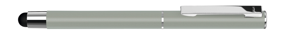 Metall-Rollerball mit mattem Gehäuse. Metallclip und Zierring silber glänzend, Griffzone schwarz. Gummiertes Schaftende für die Touchscreensteuerung.