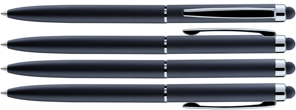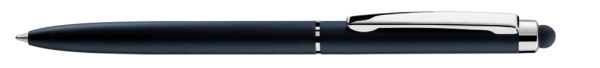 Metall-Drehkugelschreiber mit farbig mattem oder weiß glänzendem Gehäuse und silber glänzenden Beschlagteilen. Gummiertes Schaftende für die Touchscreensteuerung.