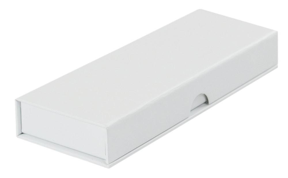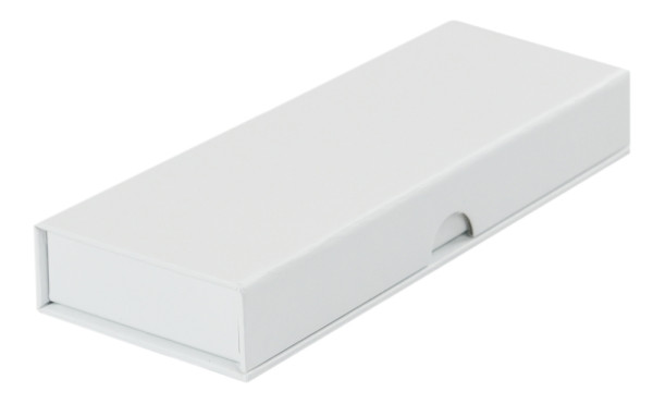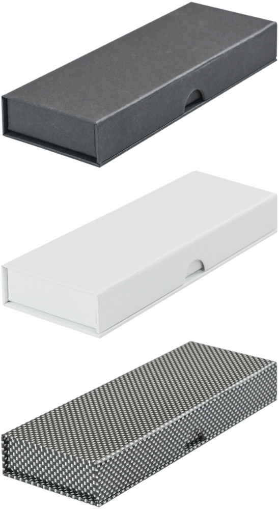 Klappetui in uni weiß, schwarz oder Carbonfaser-Look mit Magnetverschluss mit W-Einlage für ein, zwei oder drei Schreibgeräte. Kartonschuber in weiß. Auf Anfrage ist der Kartonschuber mit 4c-Gestaltung erhältlich.