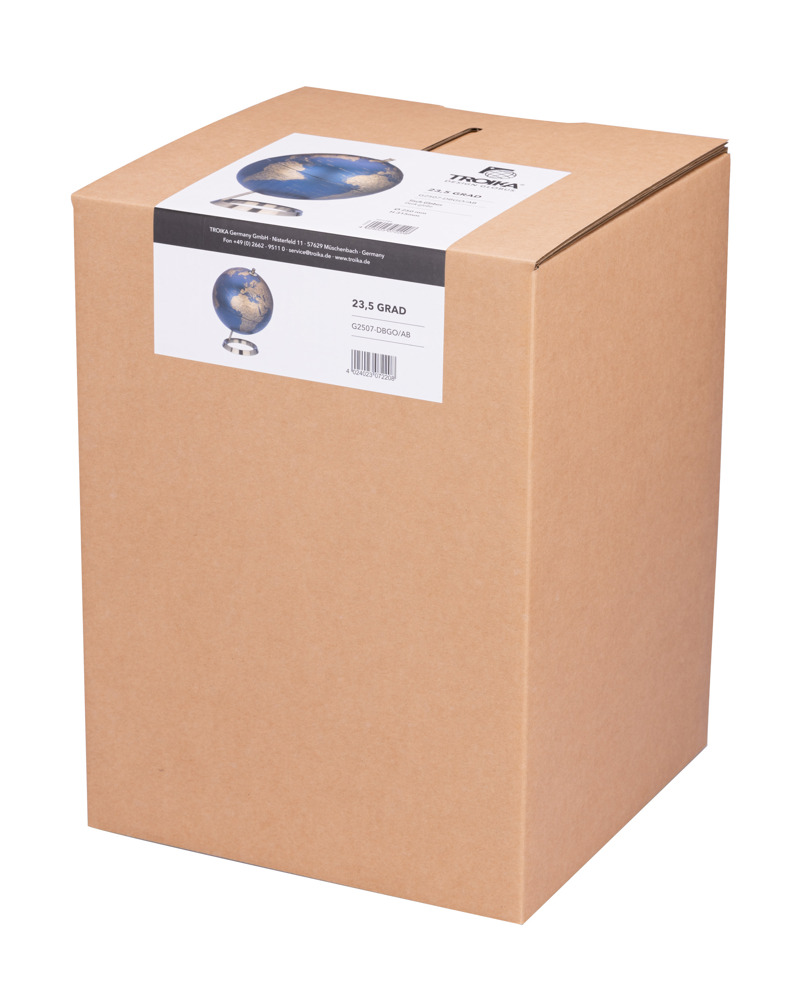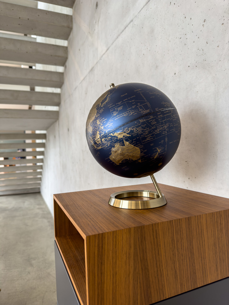 Globus mit 25 cm Durchmesser, verchromter Metallfuß in gebürsteter Optik, 23,5 Grad Neigung an beweglicher Achse, Kartenrelief, Kunststoff, Metall, matt, dunkelblau/goldfarben