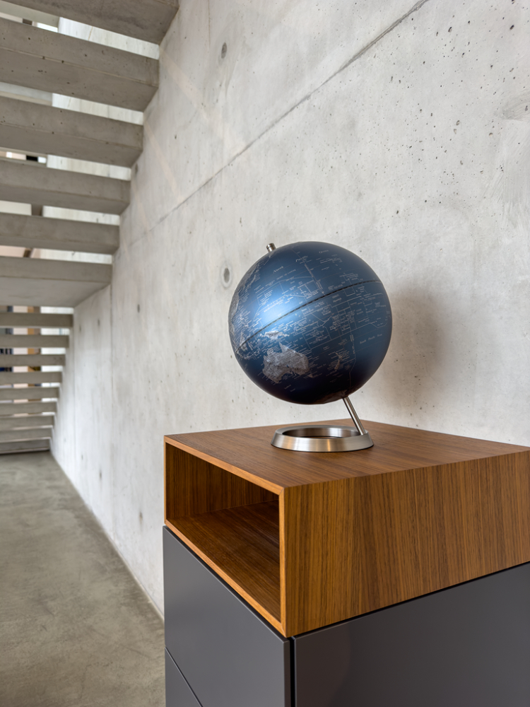 Globus mit 25 cm Durchmesser, verchromter Metallfuß in gebürsteter Optik, 23,5 Grad Neigung an beweglicher Achse, Kartenrelief, Kunststoff, Metall, matt, blau/silberfarben
