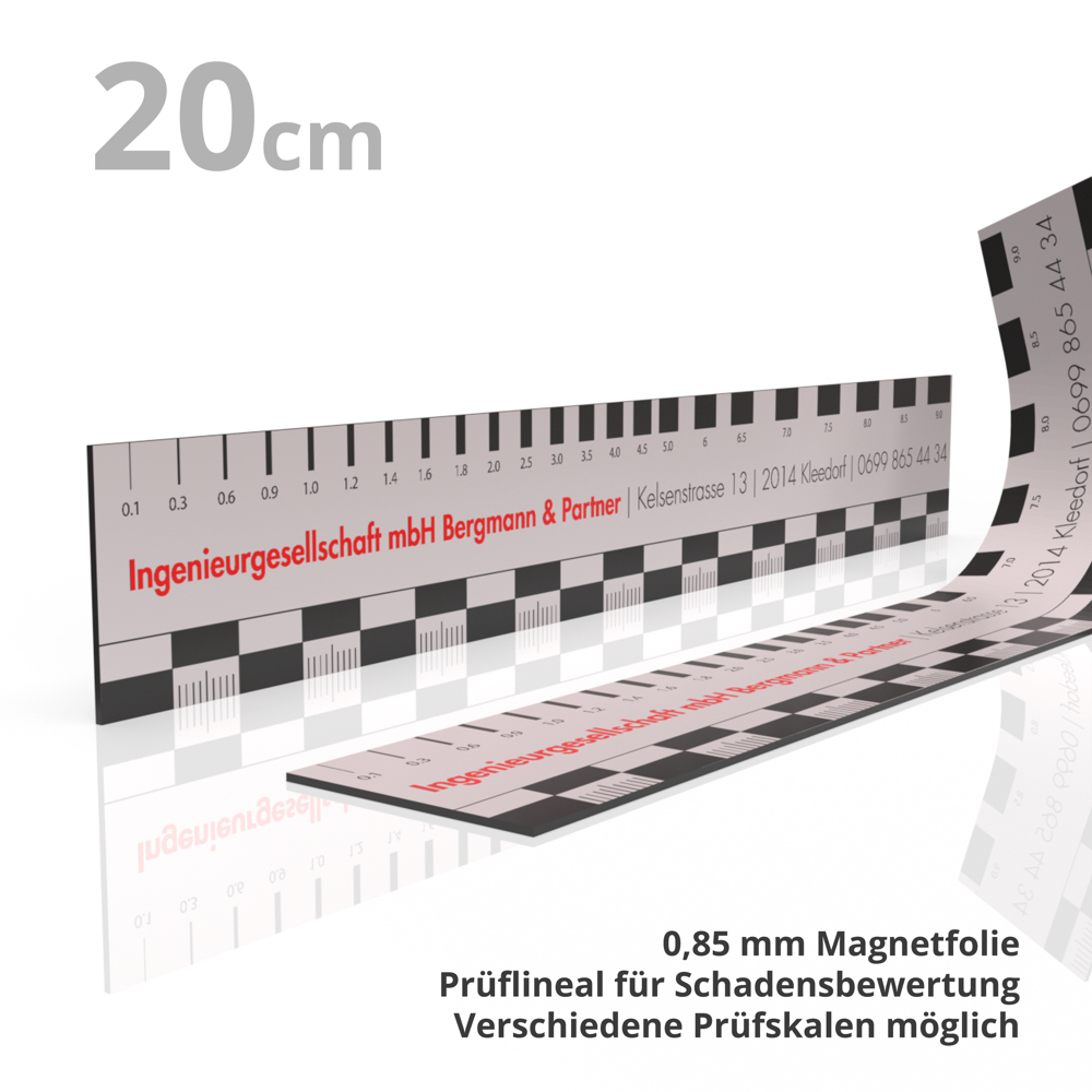 Magnetisch haftende Rissbreitenlineale mit welchen Sie den Freiraum zwischen 2 Elementen bestimmern können. Individuell bedruckt mit dem Logo findet das Spaltmaßlineal Platz in jeder Tasche von Sachverständigen.