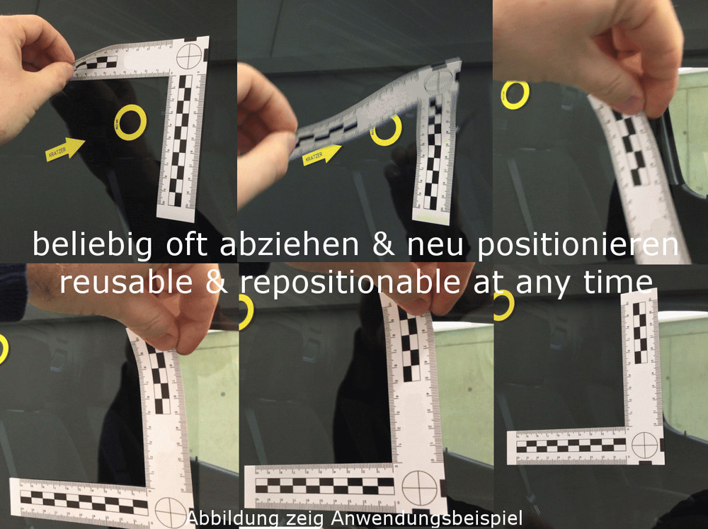 Dank der speziellen Micro-Saugnapffolie können Sie Schäden, Kratzer oder Risse präzise kennzeichnen, während Sie freie Hand für Fotografien haben. Die Pfeile sind vielfach wiederverwendbar, indem die Rückseite einfach mit Wasser gereinigt wird. Ein langlebiges, PVC-freies und in Deutschland gefertigtes Produkt, das in keinem Werkzeugkoffer fehlen sollte.