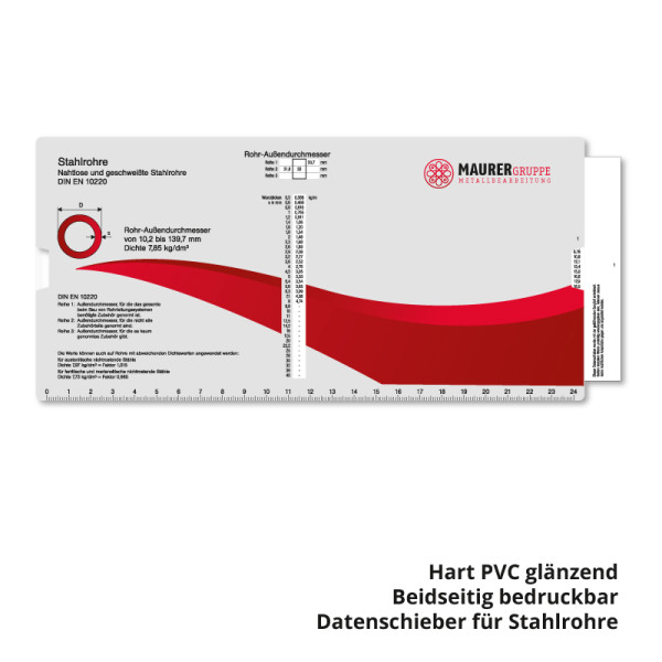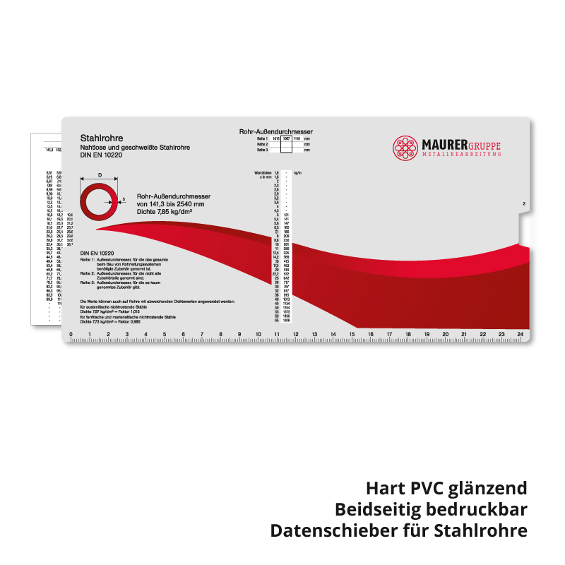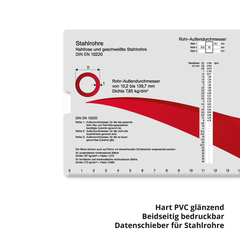Dieser Datenschieber ermöglicht die schnelle Zuordnung von Stahlrohr-Abmessungen zu Wandstärken und Gewichten – für nahtlose und geschweißte Rohre nach DIN EN Norm.