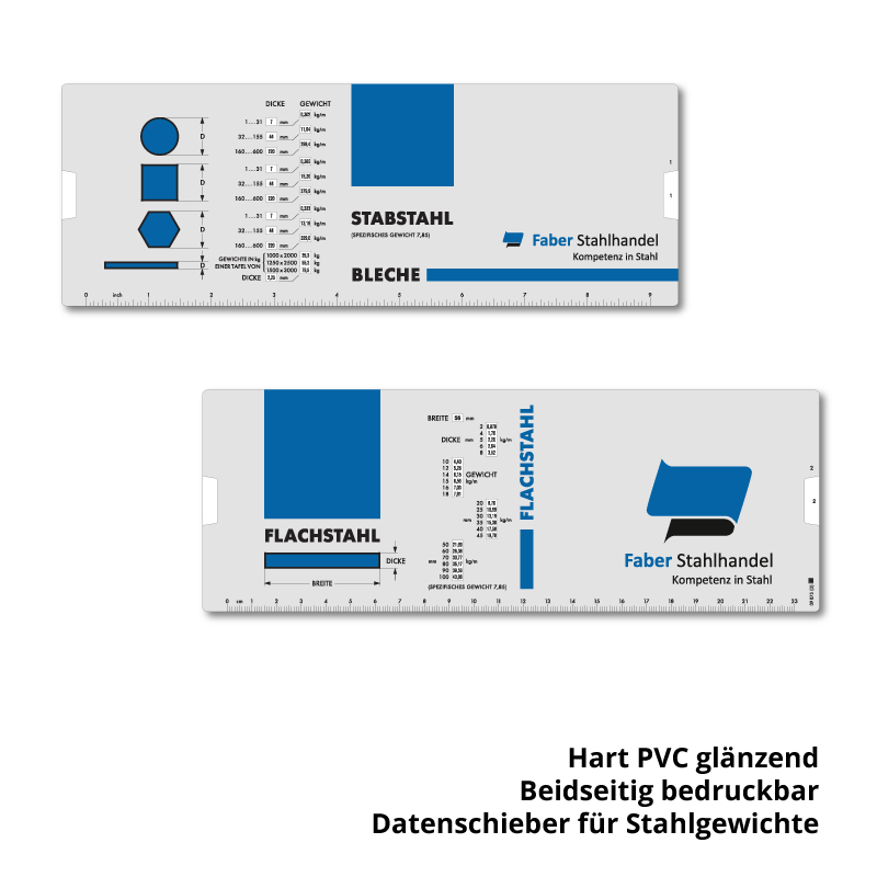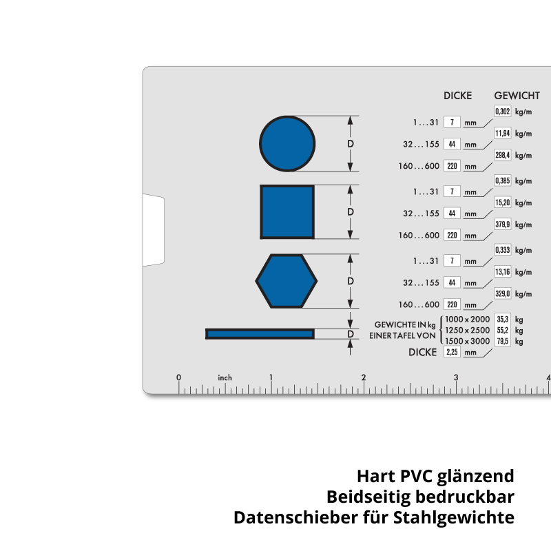 Der Datenschieber „Vollprofile & Tafelgewichte“ bietet eine kompakte und leicht verständliche Möglichkeit, Gewichte von Vollmaterialien und Stahlplatten zu bestimmen – ohne Rechner und ohne Tabellenbuch.
