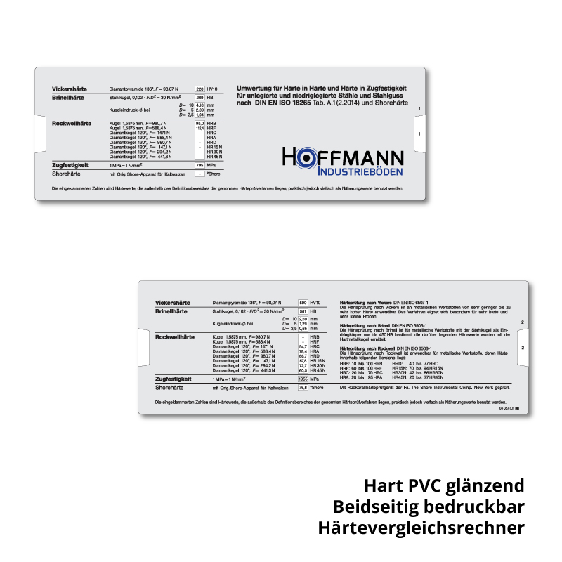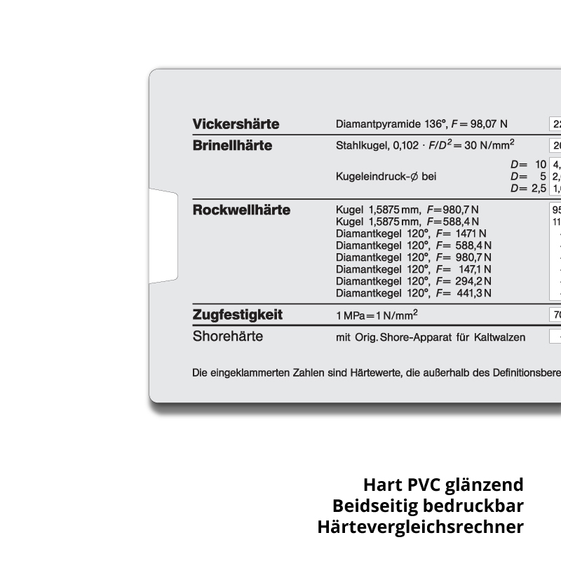 Durch einfaches Verschieben der Skalen lassen sich Vickers-, Brinell- und Rockwell-Härten, sowie Zugfestigkeit und Shore-Härte sofort miteinander vergleichen.