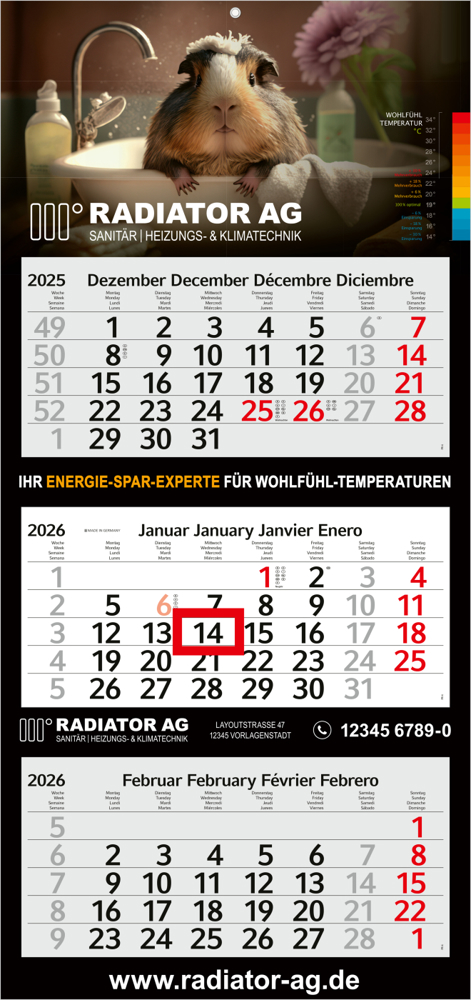 Der Profil 3 Bestseller ist ein preiswerter Mehrblock-3-Monatskalender, der durch seine großzügige Werbefläche und praktische Funktionen überzeugt. Mit einem viersprachigen Kalendarium, einer faltbaren Rückwand und hochwertigen Druckmöglichkeiten bietet er Unternehmen eine ideale Plattform für effektive Markenpräsentation. Hergestellt in Deutschland, kombiniert der Kalender Qualität, Funktionalität und Wirtschaftlichkeit.