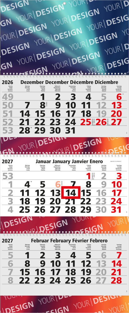 Der Maxi Wire-O 3 Bestseller ist ein hochwertiger 3-Monatskalender mit eleganter Wire-O-Bindung und einer Vielzahl an Werbeflächen. Dank seines klar strukturierten Kalendariums und der Möglichkeit zur individuellen Gestaltung ist er die ideale Wahl für anspruchsvolle Markenkommunikation. „Made in Germany“ – Qualität, die begeistert.