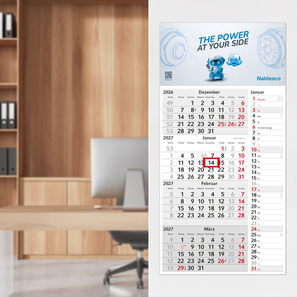 • Ausstattung: Kalenderblätter perforiert; portooptimiert zu versenden: Rückwand zum Falten gerillt; Datumsschieber rot