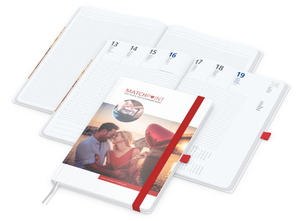 Der Match-Hybrid White Bestseller kombiniert edles Design und praktische Funktionen, ideal für professionelle Planung und Markenpräsenz. Mit seinem klar strukturierten Wochenkalendarium und der hochwertigen Verarbeitung ist er ein vielseitiges Werbemittel.