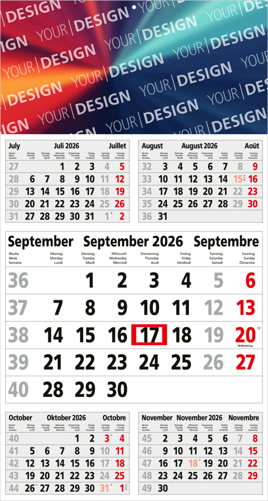 • Kalendarium: Deutsch 3sprachig D/GB/F hellgrau/rot