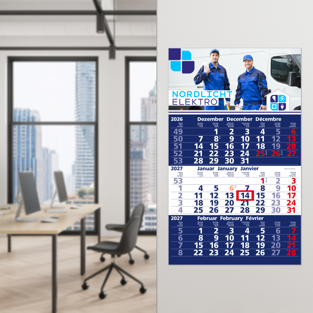 Der Solid 3 Bestseller ist ein klassischer Einblatt-3-Monatskalender und zählt zu den meistverkauften Werbekalendern. Er verbindet Übersichtlichkeit, solide Verarbeitung und attraktive Konditionen inklusive Werbedruck – ideal für Unternehmen mit hohem Stückbedarf.
