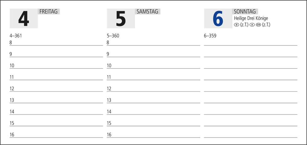 • Kalendarium: Deutsch 1sprachig; je Woche 2 Seiten; Stundeneinteilung von 8 bis 21 Uhr auf dem unteren Blatt; Notizraum und 3-Monats-Übersicht auf dem oberen Blatt; Informationsteil
