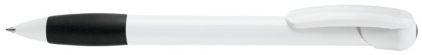 Druckkugelschreiber mit gedeckt glänzendem Gehäuse und Clipdrücker in weiß, farbige Gummigriffzone und Stopfen.