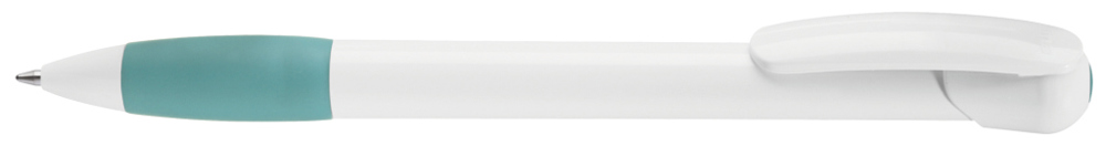 Druckkugelschreiber mit gedeckt glänzendem Gehäuse und Clipdrücker in weiß, farbige Gummigriffzone und Stopfen.