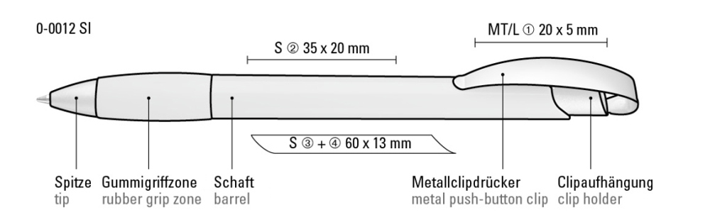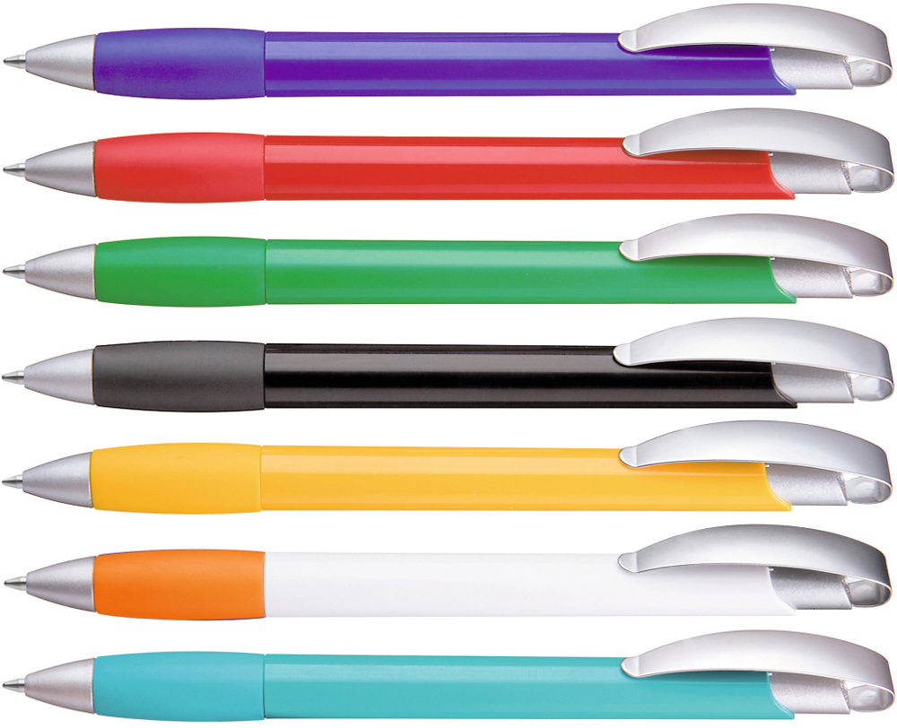Druckkugelschreiber mit gedeckt glänzendem Gehäuse, Gummigriffzone, matt verchromtem Metallclipdrücker und Spitze matt silber.