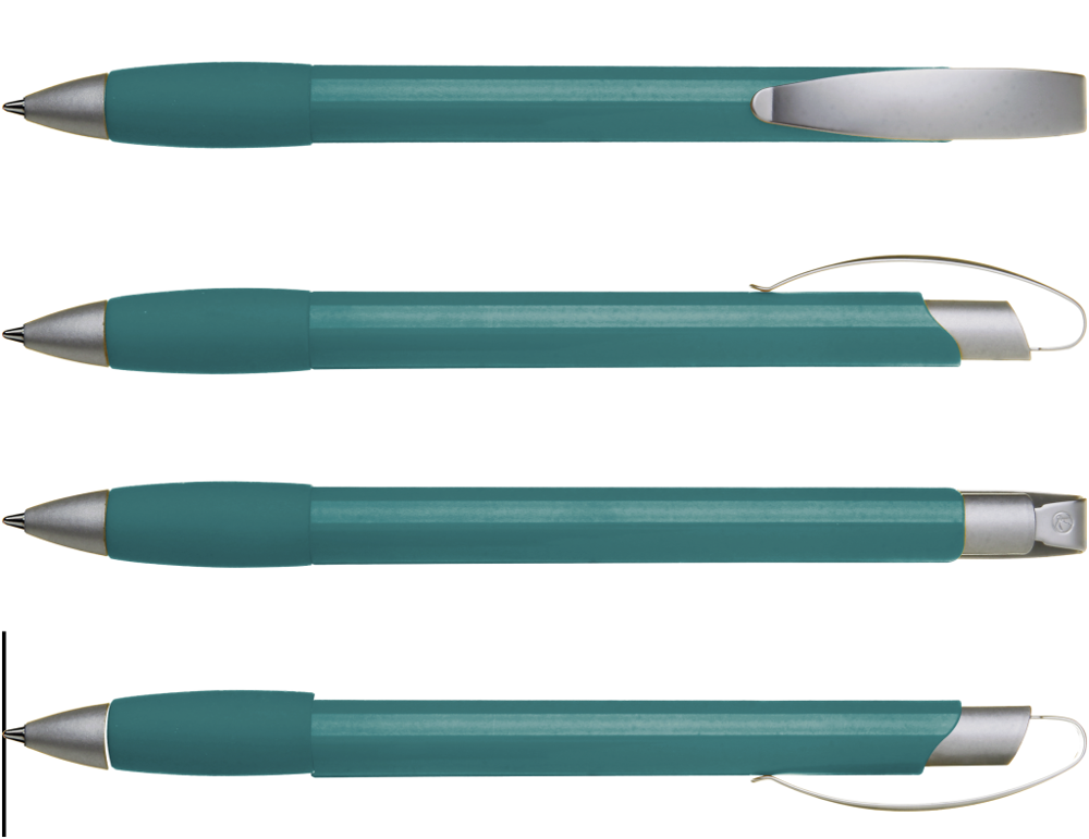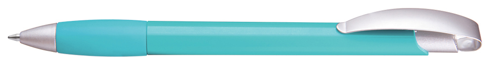 Druckkugelschreiber mit gedeckt glänzendem Gehäuse, Gummigriffzone, matt verchromtem Metallclipdrücker und Spitze matt silber.