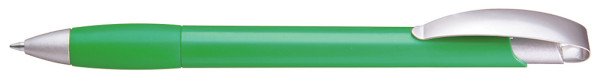 Druckkugelschreiber mit gedeckt glänzendem Gehäuse, Gummigriffzone, matt verchromtem Metallclipdrücker und Spitze matt silber.