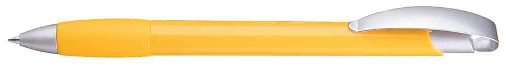 Druckkugelschreiber mit gedeckt glänzendem Gehäuse, Gummigriffzone, matt verchromtem Metallclipdrücker und Spitze matt silber.