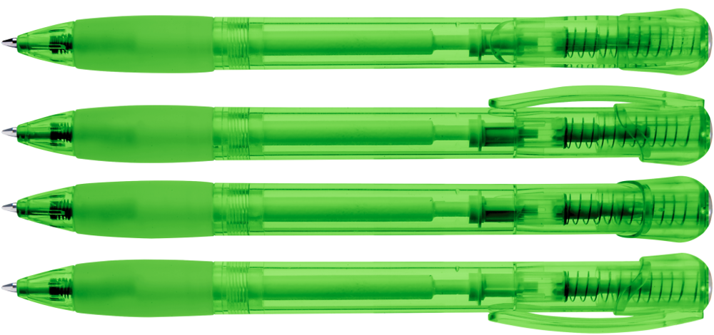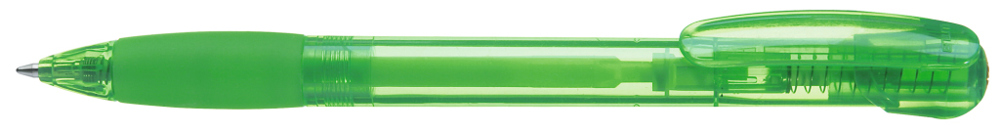 Druckkugelschreiber mit transparent glänzendem Gehäuse, Gummigriffzone und Clipdrücker. Stopfen... mehr