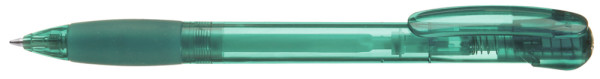 Druckkugelschreiber mit transparent glänzendem Gehäuse, Gummigriffzone und Clipdrücker. Stopfen silber metallic.
