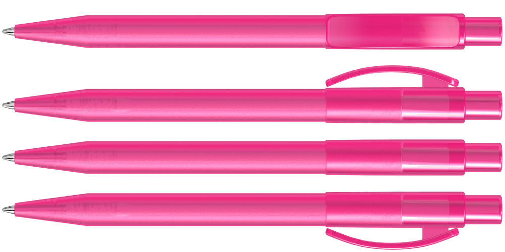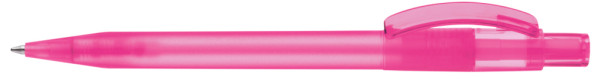 Druckkugelschreiber mit gefrostetem Gehäuse, glänzend transparentem Bogenclip und Drücker. mehr