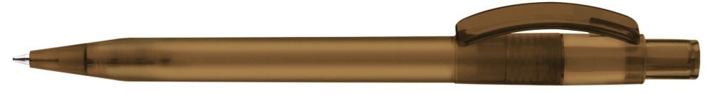 Druckkugelschreiber mit gefrostetem Gehäuse, glänzend transparentem Bogenclip und Drücker.