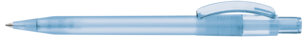 Druckkugelschreiber mit gefrostetem Gehäuse, glänzend transparentem Bogenclip und Drücker.