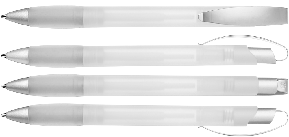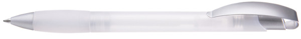 Druckkugelschreiber mit transparent gefrostetem Gehäuse, Gummigriffzone, matt verchromtem Metallclipdrücker und Spitze matt silber.