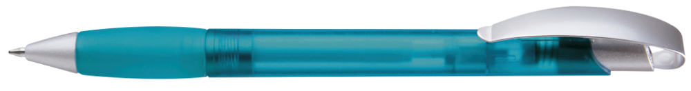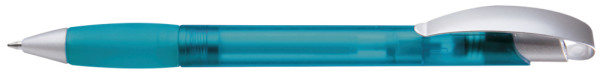 Druckkugelschreiber mit transparent gefrostetem Gehäuse, Gummigriffzone, matt verchromtem Metallclipdrücker und Spitze matt silber.