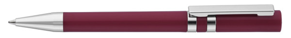 Drehkugelschreiber mit gedeckt glänzendem Gehäuse. Eingelassene Ringe, Stopfen im Oberteil, Metallclip und Spitze in silber glänzend.