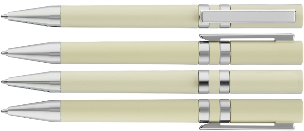 Drehkugelschreiber mit gedeckt glänzendem Gehäuse. Eingelassene Ringe, Stopfen im Oberteil, Metallclip und Spitze in silber glänzend.