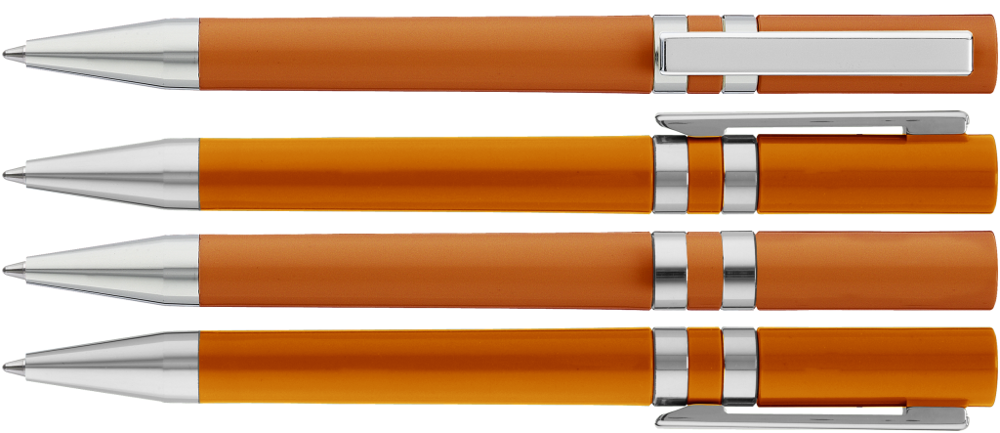 Drehkugelschreiber mit gedeckt glänzendem Gehäuse. Eingelassene Ringe, Stopfen im Oberteil, Metallclip und Spitze in silber glänzend.