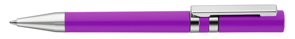 Drehkugelschreiber mit gedeckt glänzendem Gehäuse. Eingelassene Ringe, Stopfen im Oberteil, Metallclip und Spitze in silber glänzend.