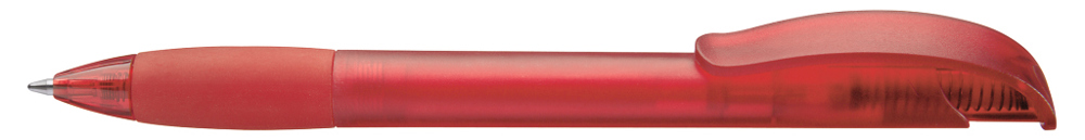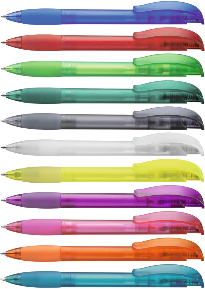 Druckkugelschreiber mit transparent gefrostetem Gehäuse, Gummigriffzone und Clipdrücker mit Stopfen.