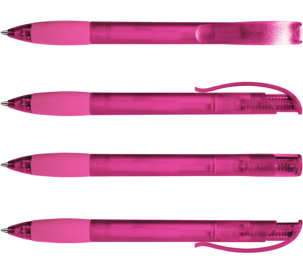 Druckkugelschreiber mit transparent gefrostetem Gehäuse, Gummigriffzone und Clipdrücker mit Stopfen.
